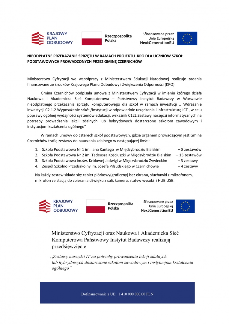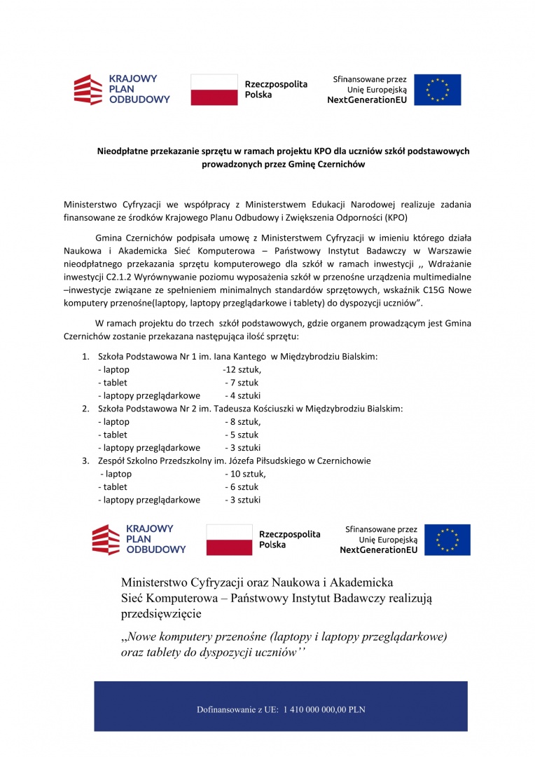 Nieodpłatne przekazanie sprzętu w ramach projektu KPO dla uczniów szkół podstawowych prowadzonych przez Gminę Czernichów