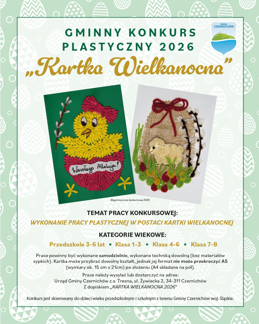 Urząd Gminy Czernichów zaprasza dzieci w wieku przedszkolnym i szkolnym z terenu Gminy Czernichów do udziału w Gminnym Konkursie Plastycznym „Kartka Wielkanocna”.