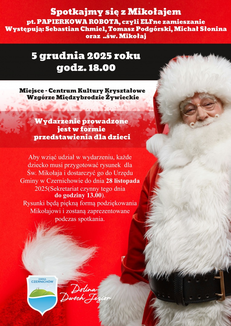 Urząd Gminy w Czernichowie z radością zaprasza wszystkich najmłodszych mieszkańców Gminy Czernichów na wyjątkowe wydarzenie, które odbędzie się 5 grudnia 2025 roku o godzinie 18:00 w Centrum Kultury Kryształowe Wzgórze w Międzybrodziu Żywieckim. Spotkanie „Spotkajmy się z Mikołajem” pt. PAPIERKOWA ROBOTA, czyli ELFne zamieszanie Występują: Sebastian Chmiel, Tomasz Podgórski, Michał Słonina oraz ….św. Mikołaj to doskonała okazja do wspólnej zabawy, integracji i magicznego czasu spędzonego z rówieśnikami oraz… samym Świętym Mikołajem!