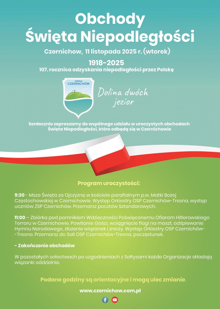 Występ Orkiestry OSP Czernichów–Tresna, uczniów ZSP oraz przemarsz pocztów sztandarowych. - 11:00 - Zbiórka pod pomnikiem Wdzięczności, wspólne odśpiewanie hymnu, złożenie kwiatów i zniczy, a następnie przemarsz i poczęstunek w Sali OSP.