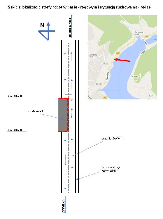 29 marca Wykonawca przebudowy drogi wojewódzkiej nr 948 powiadomił o planowym na 4 kwietnia wprowadzeniu ruchu wahadłowego sterowanego sygnalizacją świetlną na odcinku około 30 m w rejonie skrzyżowania ul. Żywieckiej z ul. Koniora w Międzybrodziu Bialskim (km 23+500 do 23+530). Na wyłączonym z ruchu prawym pasie jezdni prowadzone będą prace związane z rozpoznaniem geologicznym terenu. Pismo ze schematem w załączeniu.