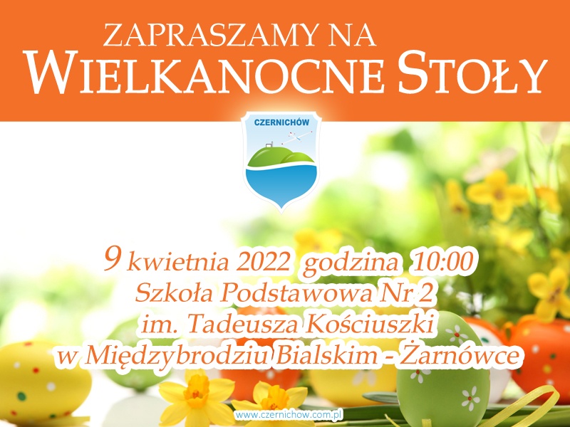 Wielkanocne Stoły Wójt Gminy Czernichów oraz Koła Gospodyń Wiejskich pragną zaprosić wszystkich mieszkańców oraz wypoczywających na terenie Gminy Czernichów na „Wielkanocne Stoły”, które odbędą się 9 kwietnia 2022 o godzinie 10:00 w Szkole Podstawowej Nr 2 w Międzybrodziu Bialskim - Żarnówce.