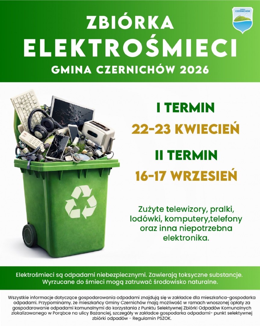 Zbiórka odbędzie się na terenie całej gminy w terminie 22-23.04.2026. Elektrośmieci należy wystawiać wzdłuż ulic w w/w terminie do godziny 08:00.