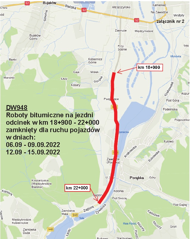 - DW948 w km 21+800 – 22+700 w dniu 05.09.2022 (w załączeniu zał. 1 - szkic z zaznaczonym zamkniętym odcinkiem DW948 między zaporą Porąbka a ul. Zaporową w Porąbce)